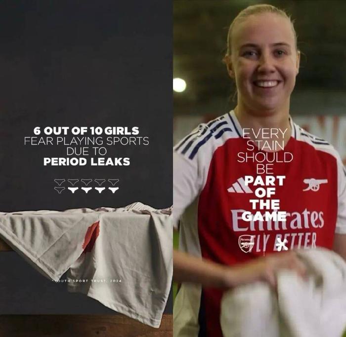 更早时候,阿森纳女足与洗护品牌Persil达成合作,紧接着拍摄的广告片则直白地告诉所有人:「血,本来就是赛场上的一部分,不必为此感到羞耻。」