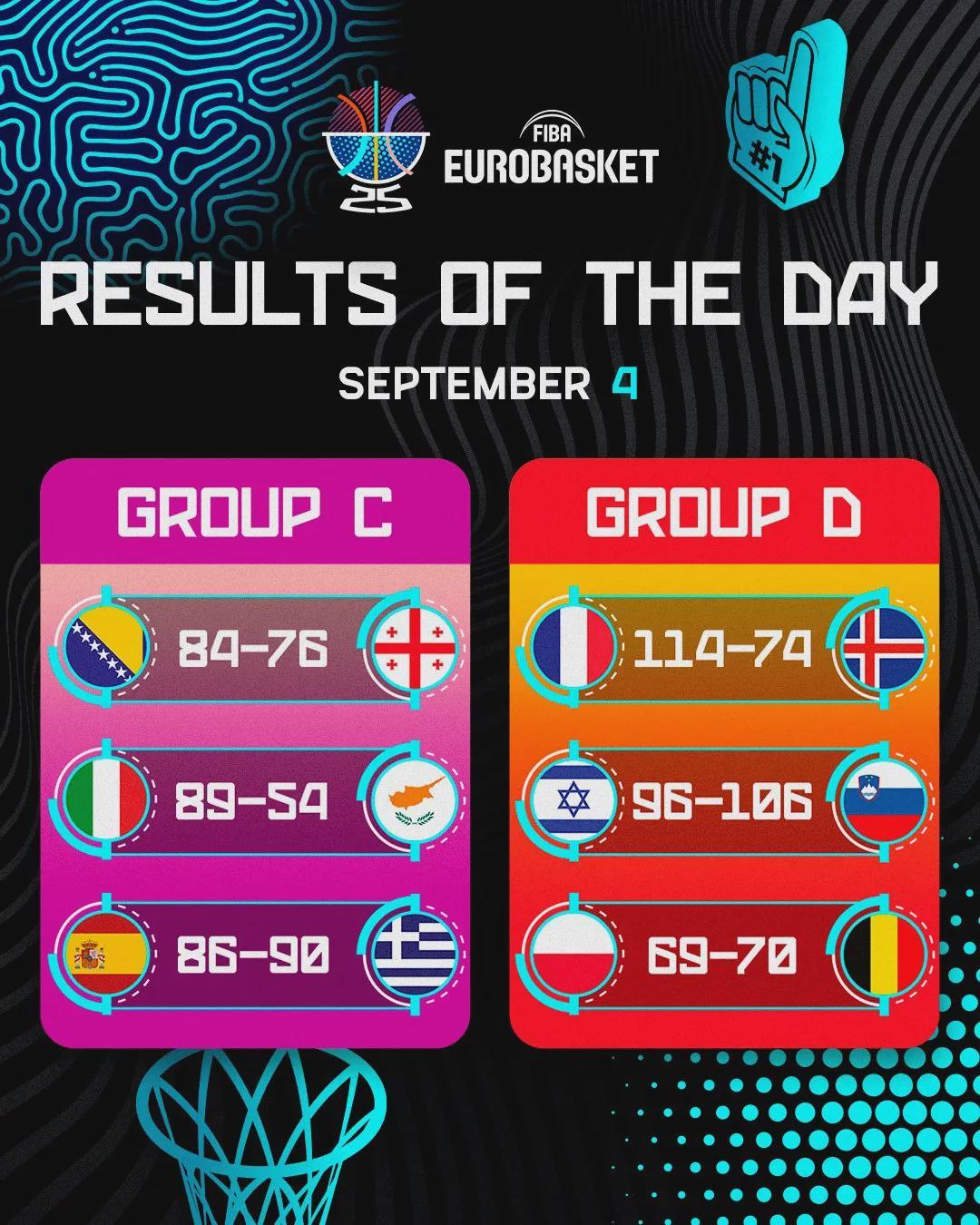 波黑84比76格鲁吉亚,意大利89比54塞浦路斯,西班牙86比90希腊,法国114比74冰岛,以色列96比106斯洛文尼亚,波兰69比70比利时。